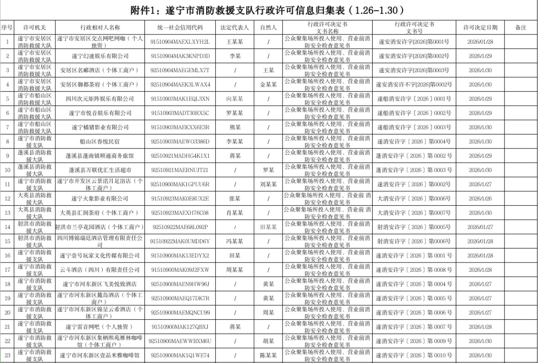 为进一步规范消防监督执法行为,提高消防监督执法工作的透明度,保障公民的知情权、参与权、表达权、监督权,推动便民利民措施落实,依据《四川省消防救援机构消防执法公示》,我支队对1月26日至1月30日的消防行政许可、行政处罚情况公示如下: