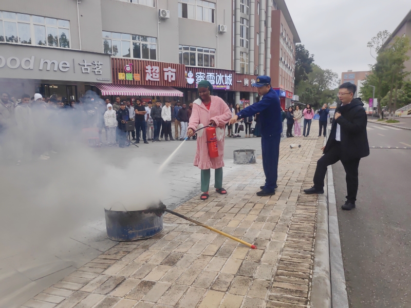 理论培训后,消防员组织参训人员开展“真喷真灭”实操演练。在消防宣传员的指导下,外籍留学生踊跃参与实操体验,按照“提、拔、握、压”的使用步骤,逐渐掌握了灭火技巧,亲手操作干粉灭火器成功扑灭模拟火源,切实提高了应对初期火灾的实际操作能力。