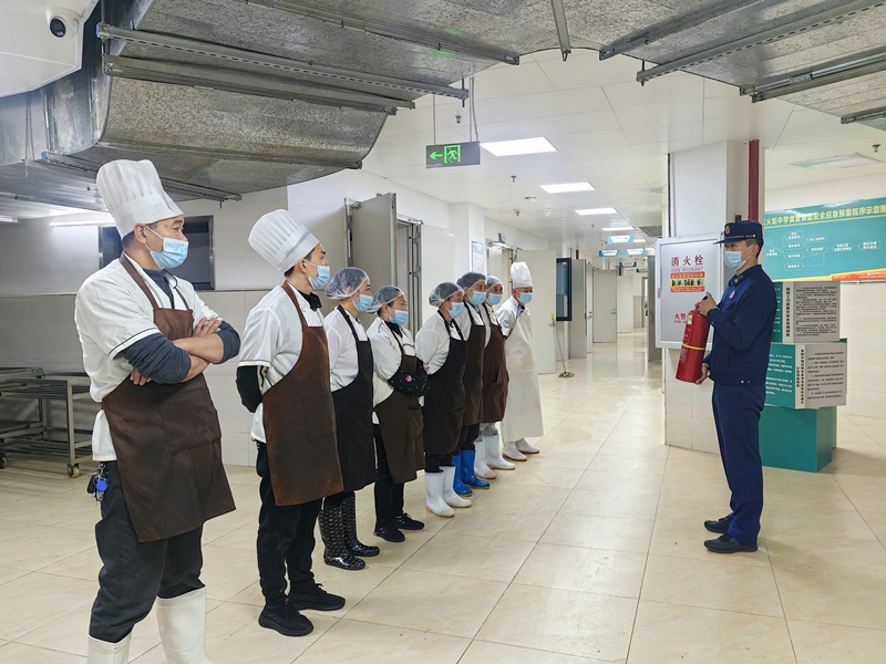 培训采取“专项讲解+实操教学+趣味普及”相结合的方式进行,同步覆盖食堂、学生宿舍、教学楼等重点部位。培训员先结合食堂和宿舍区域的火灾特点,向食堂职工、生活老师等关键岗位人员详细讲解了火灾的成因、初起火灾扑救方法、火场人员疏散逃生以及灭火器、消防栓等消防器材的正确使用方法,引导参训人员落实“人防+物防”双重责任,从源头防范火灾隐患。随后,培训员以有奖问答的互动形式向全校师生普及正确报火警的方法、火场自救及逃生方法等消防安全基本知识,以油盆灭火实操演练夯实师生们的应急处置技能。