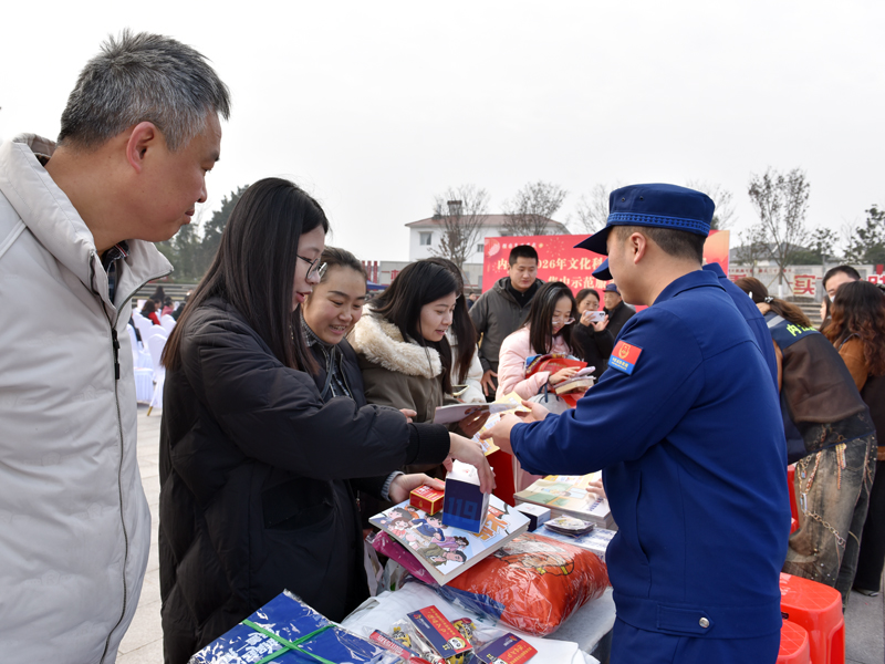 为更好宣传群众、教育群众、服务群众、凝聚群众,2月12日上午,内江市2026年文化科技卫生“三下乡”集中示范服务活动在东兴区田家镇范长江故居同心广场火热开展。内江消防紧扣活动主题,聚焦农村消防安全需求,精心组织开展消防法律法规知识宣传和消防安全技能讲解展示,切实把消防安全 “大礼包” 送到群众身边。