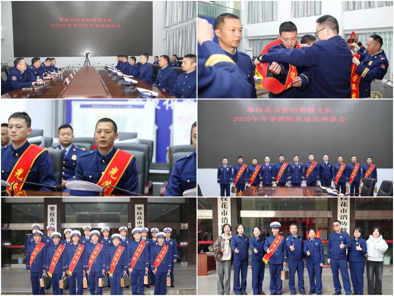 12月19日上午,攀枝花消防召开2025年冬季消防员退出座谈会,在家党委成员,2025年冬季退出消防员和所属救援站主官参加座谈。