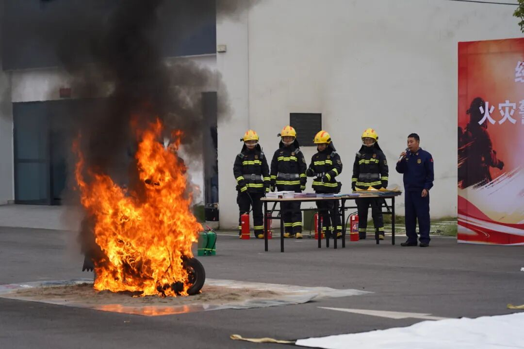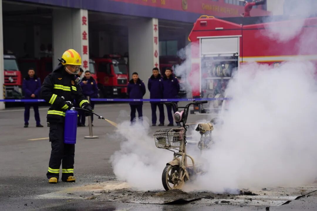 现场还原电动自行车突发火情后的处置全过程。随着“火情” 触发,火焰迅速蹿起并吞噬车身,浓烈烟气快速扩散。消防员立即行动,首先是用灭火毯覆盖火点,待明火被扑灭后,铺设消防水带,使用消防水枪进行降温。整套操作衔接紧密、高效有序。现场观摩人员直观目睹火灾“快燃、毒烟、高温” 特性,深刻掌握科学灭火的关键要点。