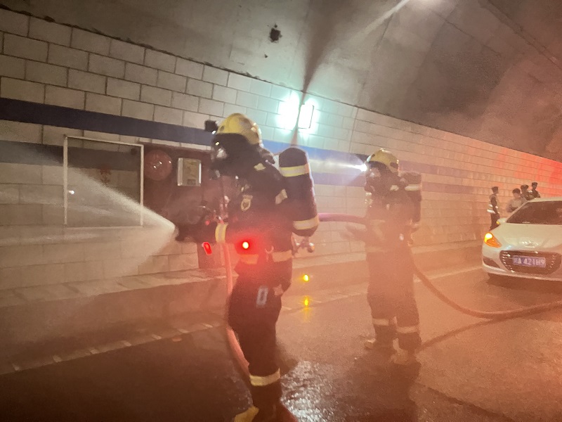 抵达现场后第一时间与各联动单位开展会商研判,结合隧道结构特点与“火情”态势,快速制定处置方案。按照任务分工,侦查组深入隧道内部侦察火势蔓延范围及有无人员被困;警戒组协同高速公安、执法部门实施现场交通管制与安全管控,严禁无关人员及车辆进入危险区域;攻坚组迅速架设水枪阵地,采取内攻灭火、梯次掩护战术压制火势;供水组同步完成水源对接与持续供水保障,确保灭火用水不间断。在各单位密切配合下,“火情”被成功扑灭,现场处置环节高效完成。