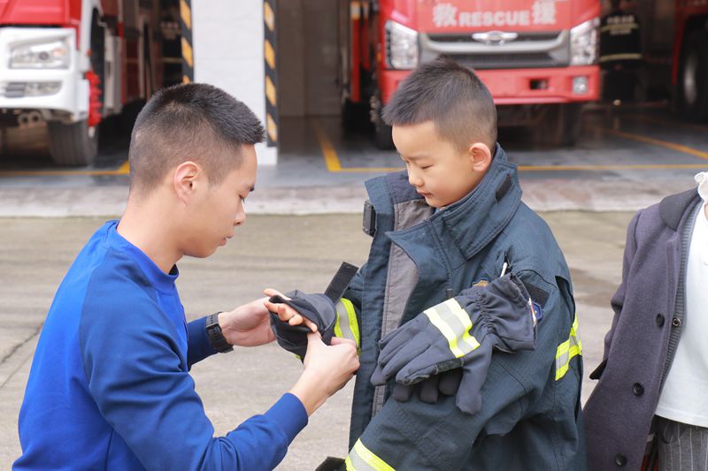 期间,圣保罗幼儿园的师生们在消防员的带领下,逐一参观了各类消防车辆及消防装备器材,了解了车辆及器材的名称、性能、功能及用途,并在现场观摩了消防员模拟不同救援场景下器材装备的操作使用,引得在场师生拍手称赞。在消防员的帮助下,小朋友还戴上了重重的头盔,穿上了厚大的消防救援服装,体验了一次 “小小消防员”。